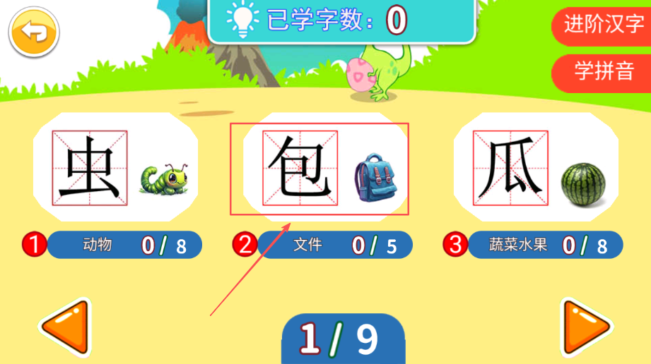 1、选择学习单元,跟随卡通角色进入汉字认知环节,初步了解字形字义。