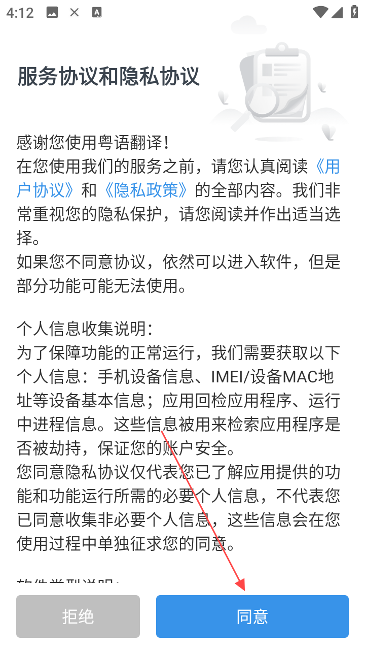 1、首次打开粤语翻译通,弹出服务与隐私协议,点【同意】。
