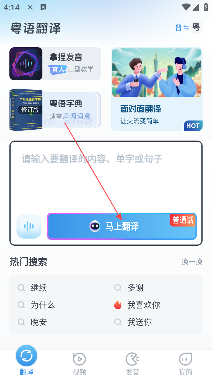 3、点【马上翻译】,自动将普通话转粤语。