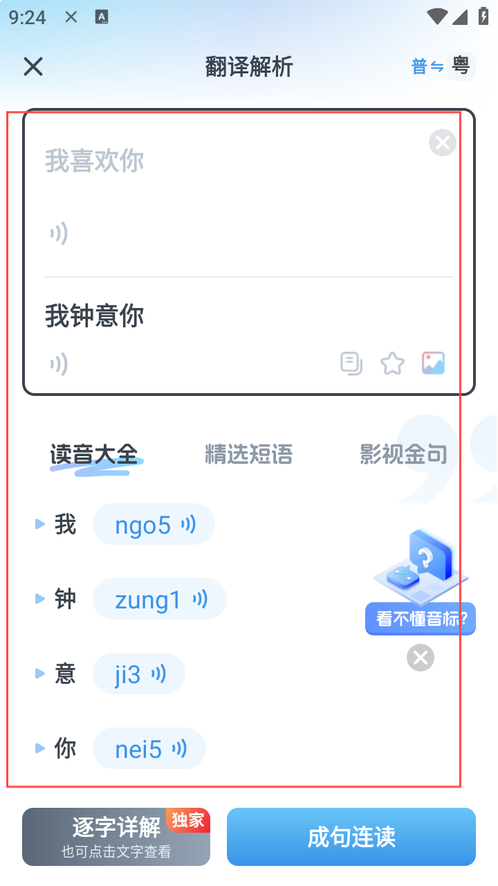 4、在翻译解析页,查看粤语翻译结果、读音、短语等拓展内容。