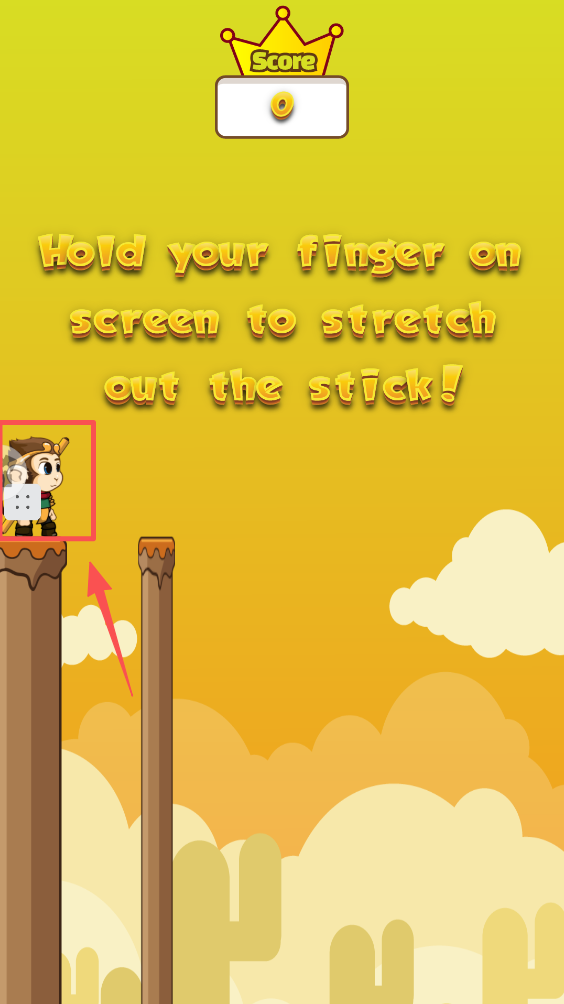 2、按住屏幕以拉伸小猴手中的棍子,确保能够跳到下一个平台。