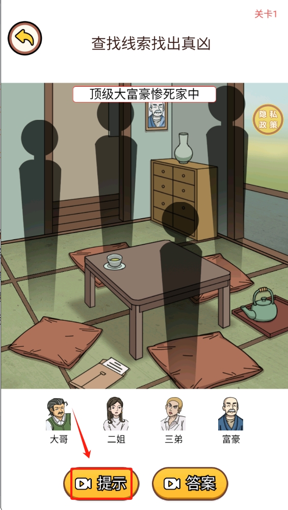 3、点击“提示”按钮获取线索,找出真凶,利用提示帮助解开谜题。