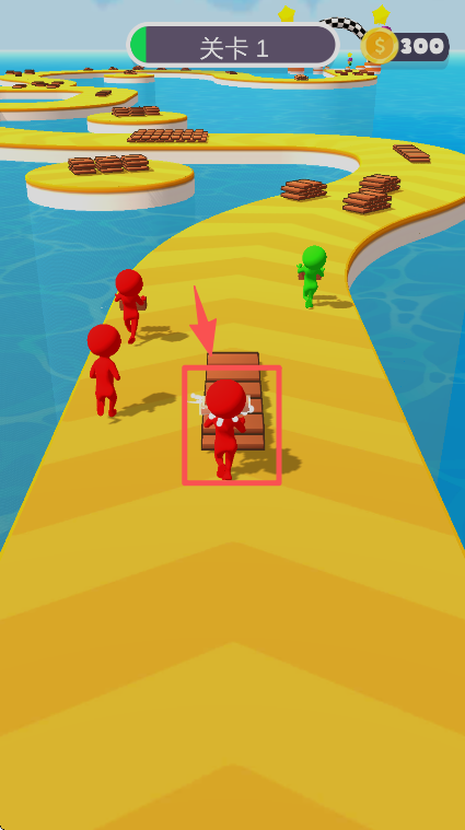 2、在关卡 1 中,操控红色角色拾取路径上的木板,跟随其他角色前进,积累搭桥材料。