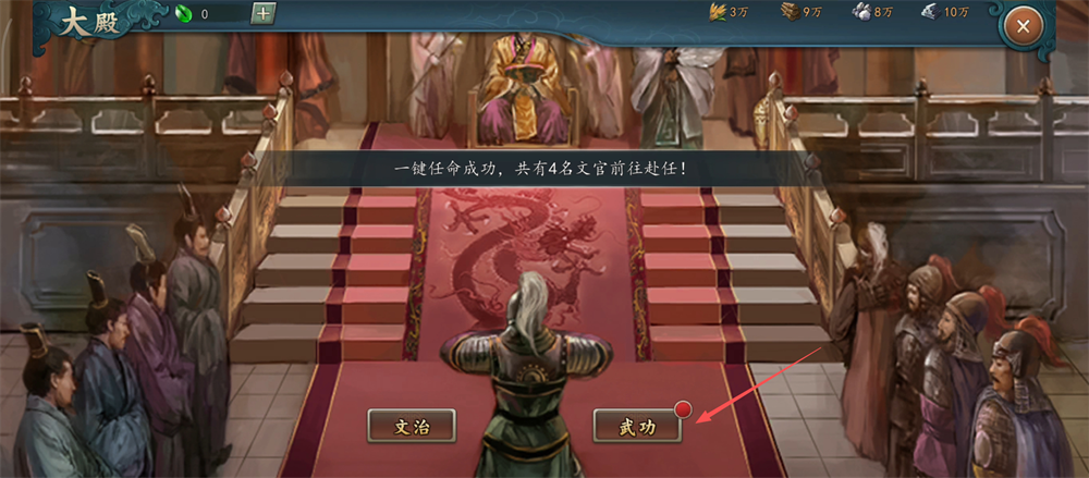 2、在大殿界面,点击【武功】按钮,进入武将任命界面,为增强战力做好准备呀。