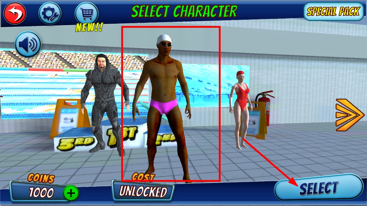 1、在角色选择界面,点击【SELECT】按钮,选定想要操控的游泳角色。