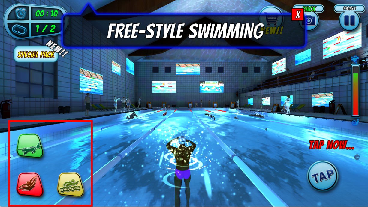 3、游泳过程中,可根据需要点击左侧不同的游泳姿势按钮,切换角色的游泳方式。