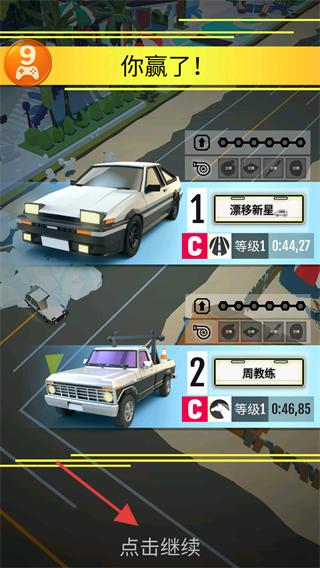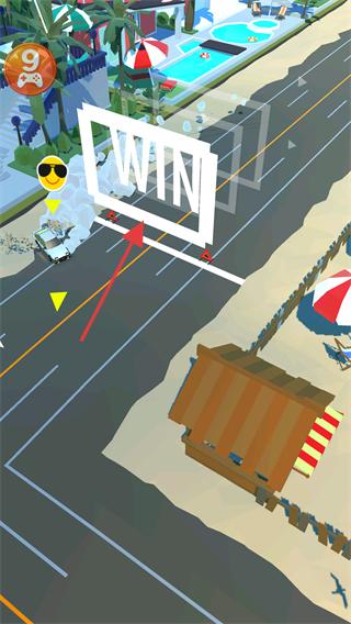 3、持续漂移行驶,率先冲过终点线后,会触发“WIN”提示,完成关卡胜利条件。